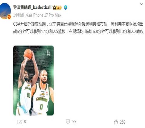 根据媒体人导演我躺哪_basketball报道:“CBA开启外援变动期,辽宁男篮已经裁掉外援奥利弗和布朗。”