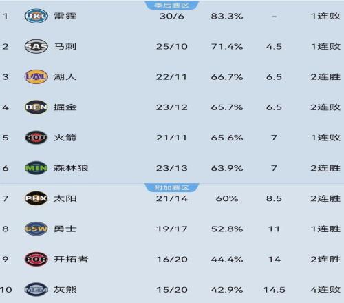 随着森林狼4连胜,独行侠2分憾负,西部最新积分榜出炉!湖人第5