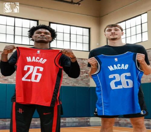 NBA官方分享火箭球员阿门-汤普森和独行侠球员弗拉格的照片庆祝中国赛,图片中,两人分别手持母队球衣,球衣上面印着26号MACAO(2026年澳门)。