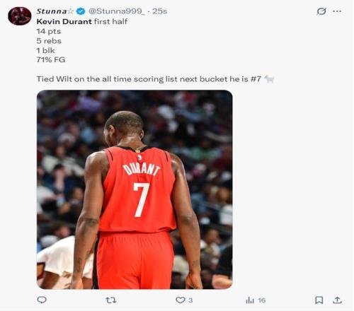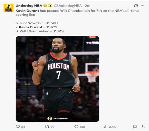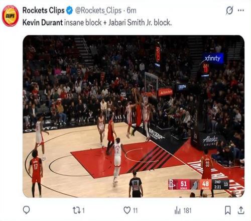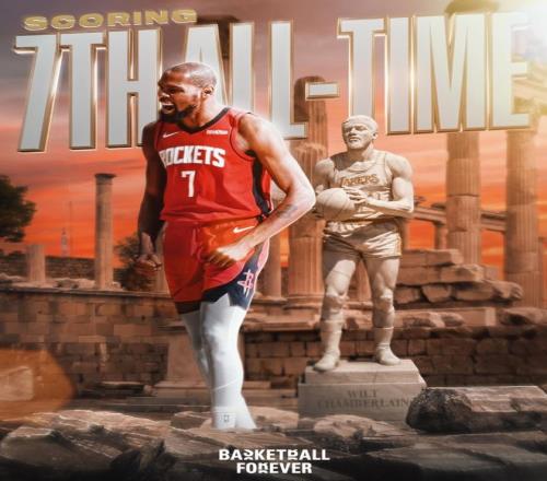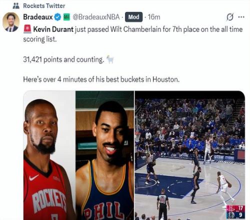 火箭记者Bradeaux写道:杜兰特完成31421分,而且他的得分还在提升,超越张伯伦后他会超越更多人,GOAT。