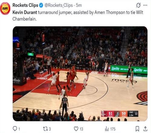 这场比赛杜兰特的得分爆发力没有上一场那么爆炸,因为阿门也有一个不错的发挥。在第二节还剩1分54秒杜兰特后仰命中拿到第14分,他生涯总得分追平了张伯伦升至历史第七位。