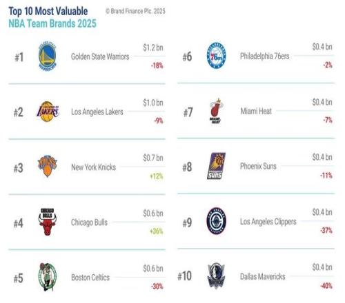 2025美国NBA品牌价值30强球队榜单,金州勇士队、洛杉矶湖人队、纽约尼克斯队列前三