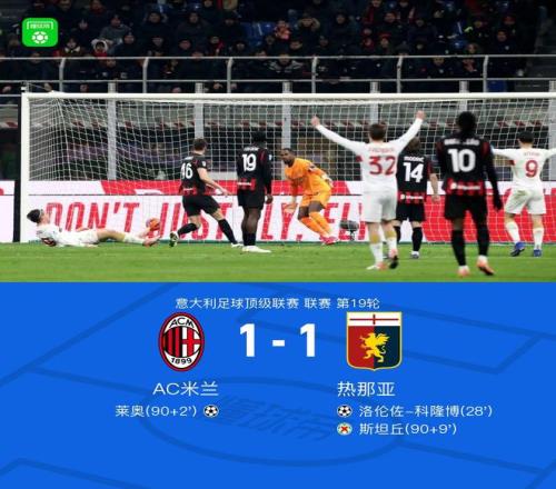 北京时间1月9日,意大利足球顶级联赛第19轮,AC米兰坐镇主场迎战热那亚。上半场,科隆博弑旧主,福法纳面对空门离奇滑倒。下半场补时阶段,莱奥头槌扳平比分。读秒阶段,热那亚获得点球,但是斯坦丘罚失。全场比赛结束,米兰1-1热那亚。